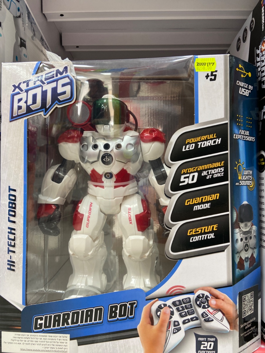רובוט עוצמתי על שלט עם הבעות פנים, קולות ואורות